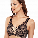 Дизайн этого бюстгальтера – вне трендов, вне времени. Роскошное кружево и имитация шнуровки между чашками относят нас во времена корсетов. Фестоны с тончайшими «ресничками», украшающими линию декольте, напоминают о французском шантильи. Форма чашек бралетт – дань моде современности.