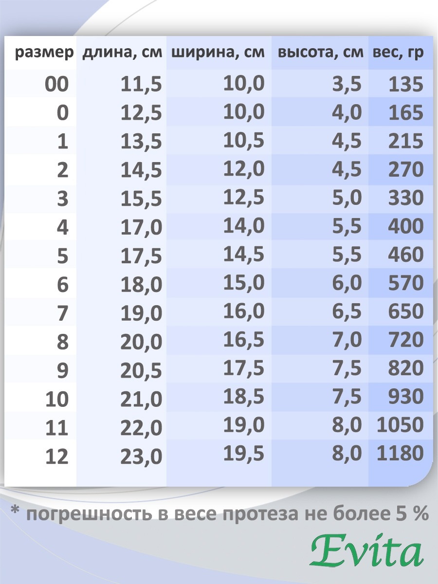 Экзопротез молочной железы Evita силиконовый овальный ПГЖ101 EVITA Экзопротез молочной железы симметричной формы изготовлен из высококачественного нетоксичного, гипоаллергенного силиконового геля, в симметричном исполнении, плотность которого соответствует плотности настоящей груди. Экзопротез имеет мягкую и нежную структуру, быстро принимает температуру тела.Внешнее покрытие – специальная двухслойная матированная полиуретановая оболочка, схожая на ощупь с кожей. Экзопротез имеет мягкую и нежную структуру, быстро адаптируется к температуре тела.Предназначен для постоянного дневного ношенияОбеспечивает сбалансированную осанкуКомпенсирует весовой дисбалансПредупреждает вторичные деформации телаФорма имеет максимально естественный вид женской грудиЕстественно выглядит в положении стоя или лежаСоставПлатиновый силиконовый гельМатированная полиуретановая пленка (2 слоя)Подбор размераЗная размер бюстгальтера, воспользуйтесь таблицей соответствия размеров и выполните несколько простых действий:В верхней строке «Обхват под грудью» отыщите свой размер бюстгальтераСпуститесь по столбцу вниз и найдите размер вашей чашечки;Мысленно проведите линию влево и определите какой экзопротез соответствует вашему размеру белья. ПГЖ101ula /upload/iblock/6cb/6cb4afee700931e9f9a5ee7a6f97ba89.jpg